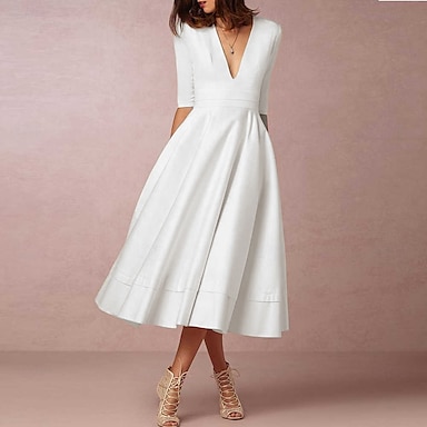 A-Line Tea Length Wedding Dresses Bridal Shower Dresses Bridal Gown Vintage 1940s / 1950s Little White Dresses 3/4 Length Sleeve V Neck Graduation Birthday Satin Tulle with Solid Color